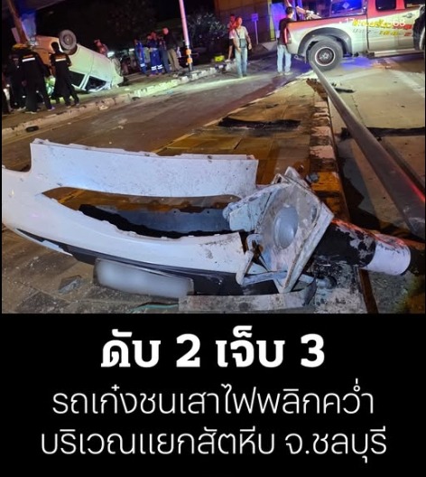 ดับ 2 เจ็บ 3 รถเก๋งแหกโค้งพลิกคว่ำ ชนเสาไฟเกาะกลางถนน แยกสัตหีบ จ.ชลบุรี